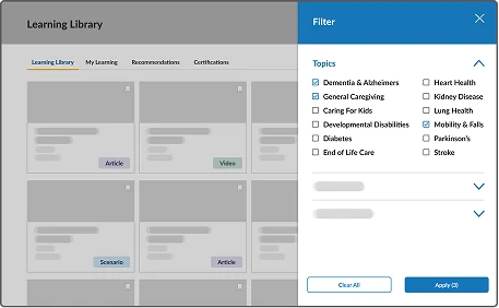 Access a library of resources designed for caregivers. Build skills, gain confidence, and discover ways to make caregiving less stressful for both you and your care recipient.